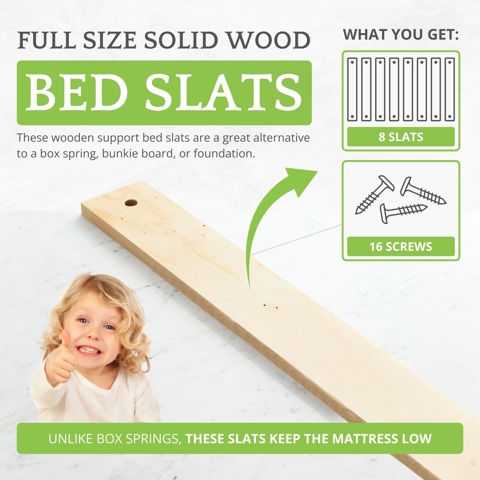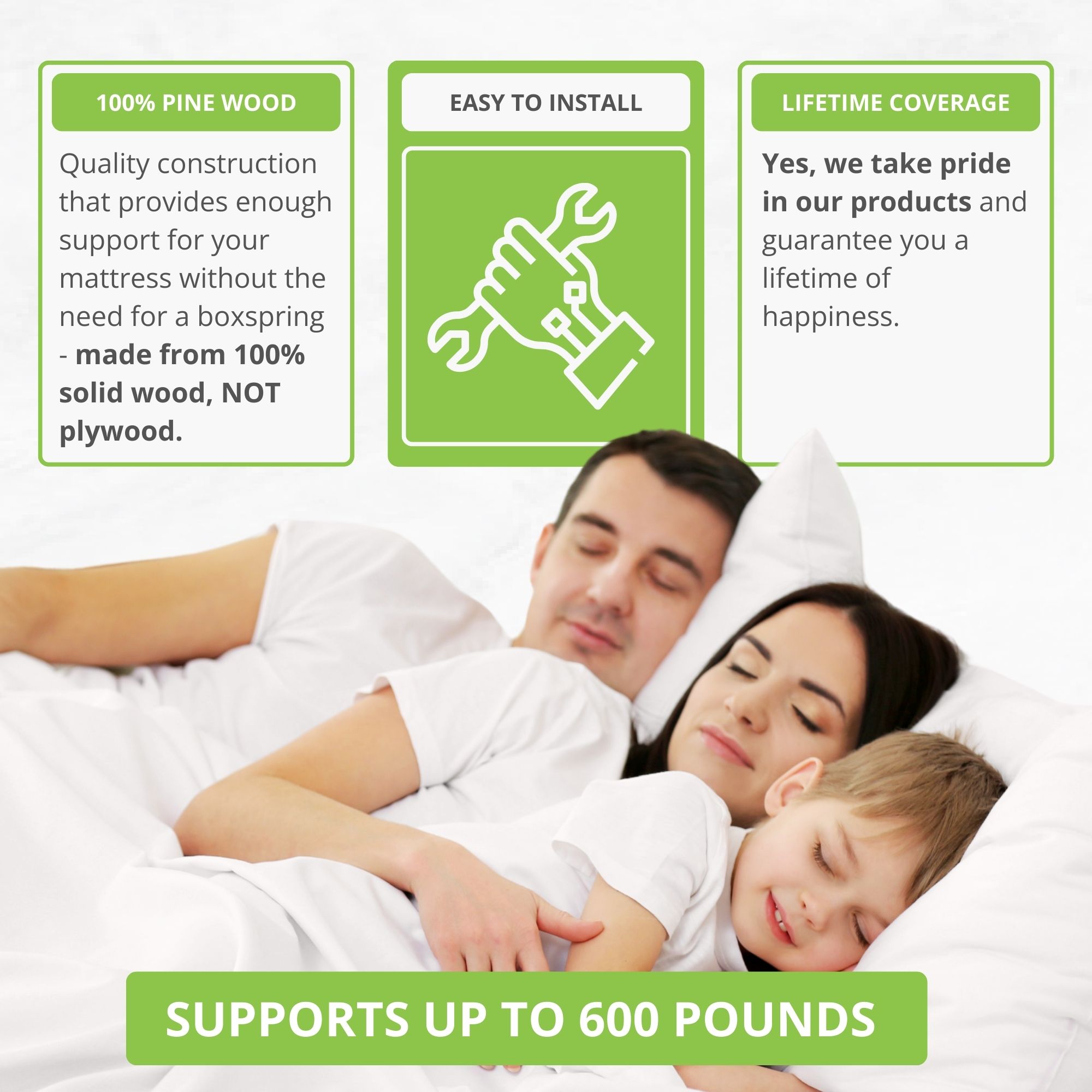 PREMIUM BUNKIE BOARD QUALITY: Our bed slats are crafted from sustainably harvested solid pine wood, offering exceptional durability and long-lasting support. These twin, full, queen, and king bed slats deliver superior strength, providing a stable foundation that prevents creaking or sagging over time. The solid wood slats are designed to maintain their integrity, ensuring a reliable investment for years of restful sleep. Plus, these bed slats come with a lifetime warranty!