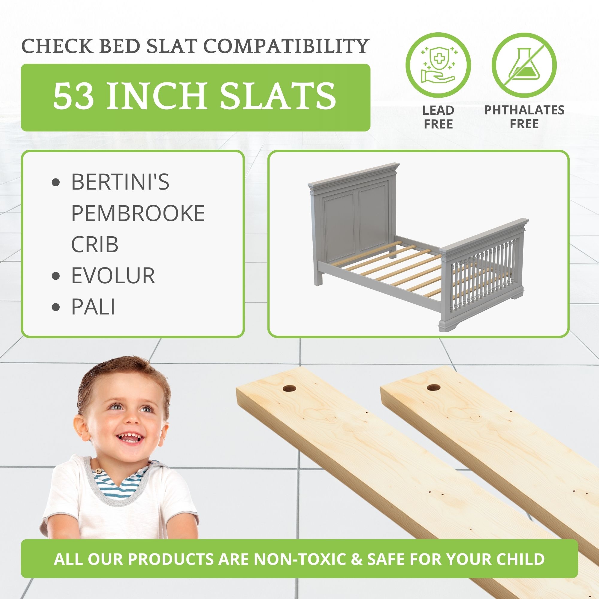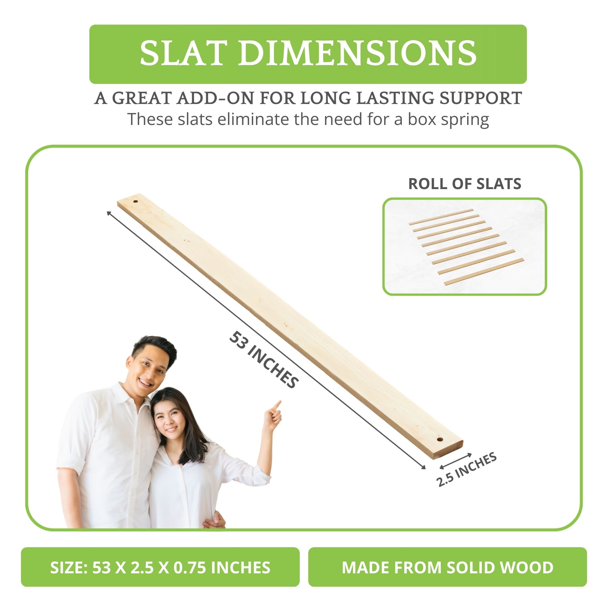 COMPLETE BED SLATS PACKAGE: For twin & full, this bed slat set includes eight (8) high-quality wood slats with screws for secure attachment. For queen & king sizes, the set includes ten (10) slats, a middle support bar & four adjustable legs that provide additional support with heights adjustable from 7″-11″ to fit your bed frame. Contact us for higher leg options if needed. Available sizes: 39″ (twin), 52½”, 53″, 53¼”, 53½”, 53¾”, 54″ (full size beds), 60″ (queen), and 76″ (king).
